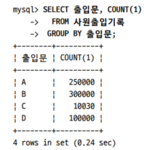 - 사원출입기록 테이블 중 출입문 B는 총 66만건 데이터 중 30만건을 차지하므로 전체 데이터의 50%