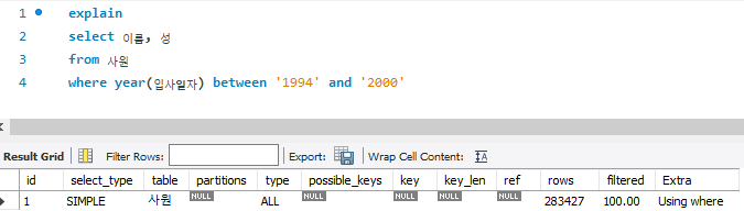 - type 항목이 ALL로 테이블 풀 스캔으로 접근(rows : 약 30만개)