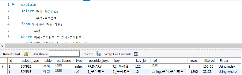 - 부서사원_매핑 테이블에 30만 건 이상의 데이터를 MySQL 엔진으로 가져온 모든 데이터에 대해 where 절의 필터 조건(매핑.시작일자) 수행하기 때문에 매핑.시작일자 조건절을 먼저 적용할 수 있다면 조인 시 비교 대상 줄어듬