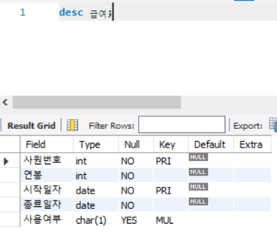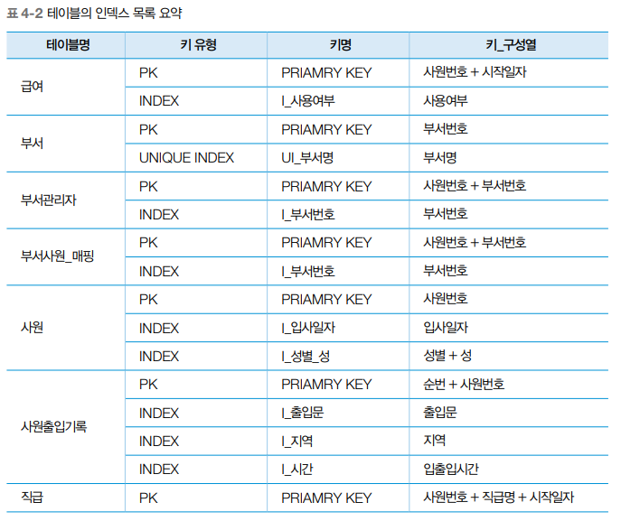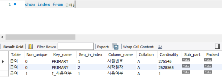 - 기본 키는 사원번호/시작일자 이며, I_사용여부 인덱스는 사용여부 열로 구성