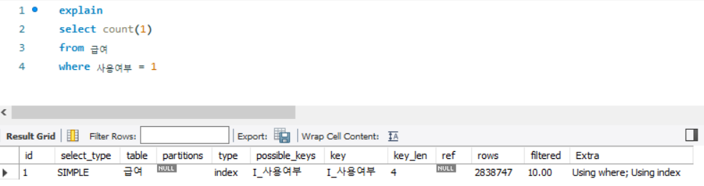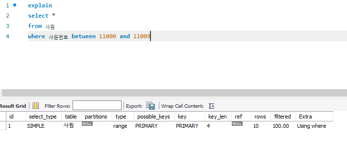 - filtered 항목이 10.00이므로 MySQL 엔진으로 가져온 데이터 중 10%를 추출해서 최종 데이터를 출력함