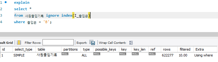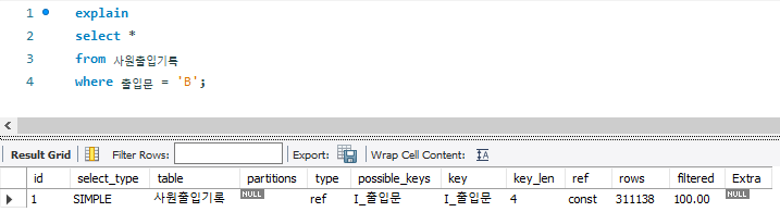 => 앞의 실행계획에 따르면 I_출입문 index로 index scan을 수행하는데, 전체 데이터의 약 50%에 달하는 데이터를 조회하기 위해 인덱스를 활용하는 것은 효율적이지 않을 수 있다.