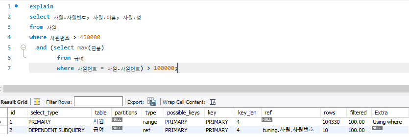 - 사원테이블은 primary key를 활용해서 index range scan 수행, 그 후 급여 테이블은 외부 테이블인 사원테이블로부터 조건을 전달받아 수행하는 의존 서브 쿼리(dependent subquery)로 수행