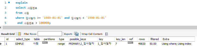 - 입사일자 열 기준으로 매 번 1994~2000년의 데이터를 조회하는 경우가 잦다면, 랜덤 액세스의 부하가 발생하도록 하기보단 테이블 풀 스캔 방식으로 설정하는 것이 효율적일 수 있음