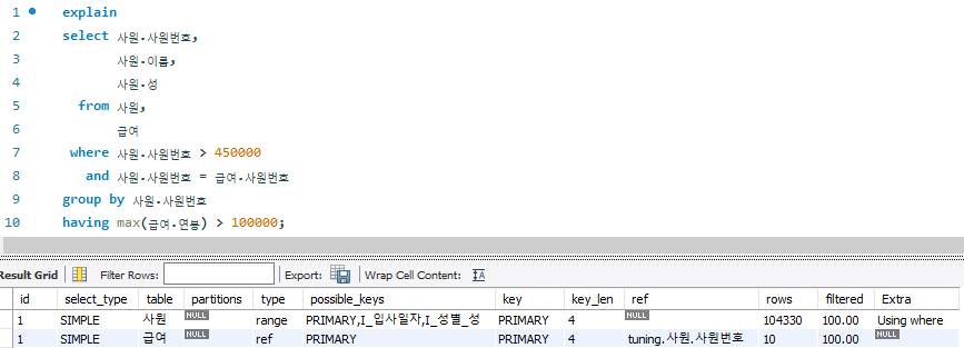 - 사원 테이블은 primary key를 사용해서 조인 조건절인 사원번호 컬럼으로 데이터 비교하기 때문에 type 항목에 eq_ref로 표시