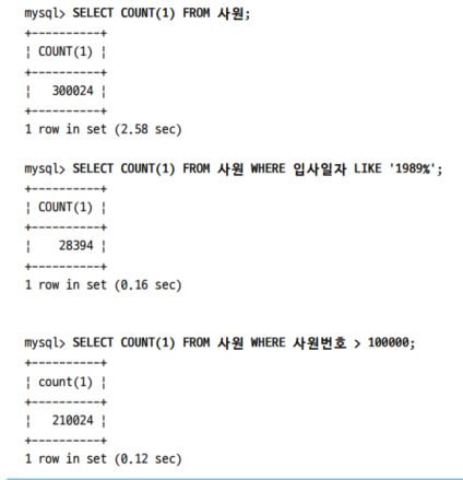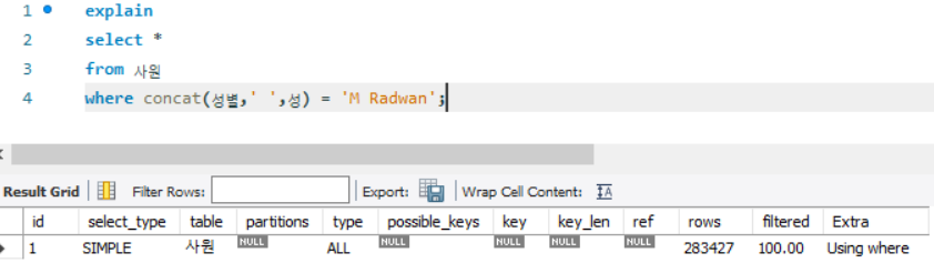 - 기본키인 사원번호 접근 시 WHERE 절에서 가공하여 접근
