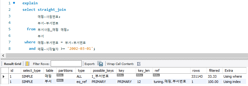 - straight_join 힌트를 사용하여, from절에 작성된 테이블 순서대로 조인에 참여할 수 있도록 고정