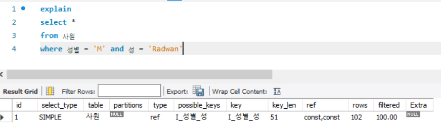 - where 절의 성별 / 성 컬럼이 동등 조건으로 작성되어 있으므로, I_성별_성 index로 빠르게 조회 가능