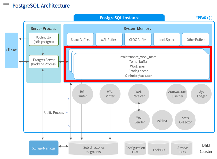 PostgreSQL / PPAS Engine 은 크게 Postmaster, Shared Memory, Backend Memory, Utility Process 영역으로 구성 된다. 세부적인 기능은 아래와 같다.