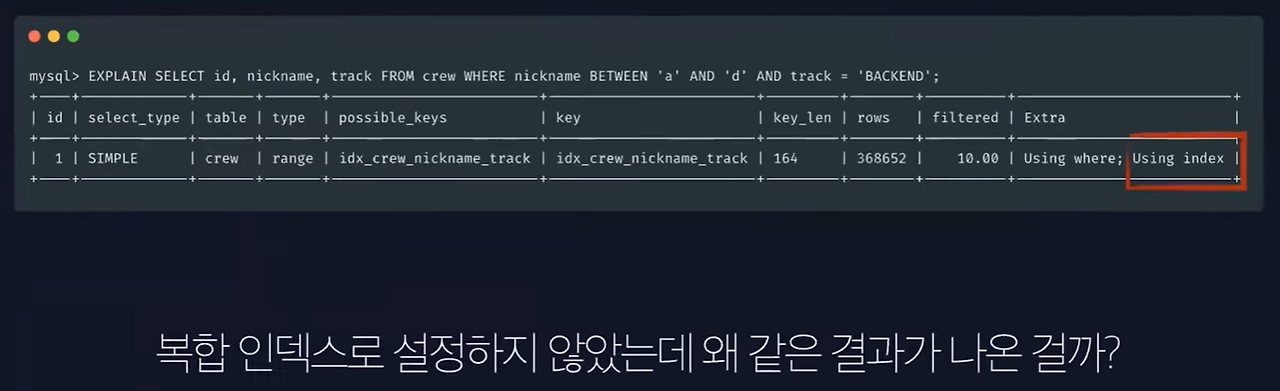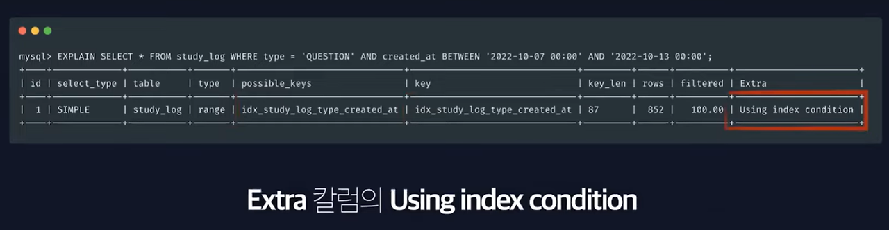 - Extra 컬럼의 Using Index Condition은 인덱스 컨디션 푸시다운으로 인해 표시