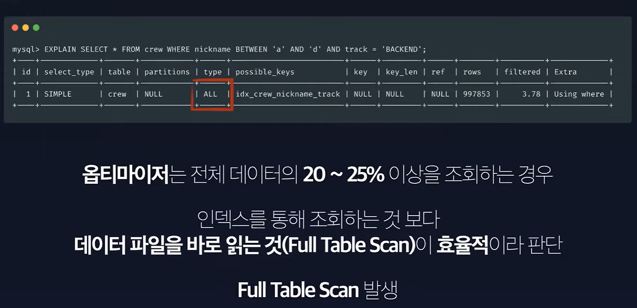 옵티마이저는 전체 데이터의 20 ~ 25% 이상을 조회하는 경우 인덱스를 통해 조회하는 것보다 데이터 파일을 바로 읽는 것(Full Table Scan)이 효율적이라 판단한다.