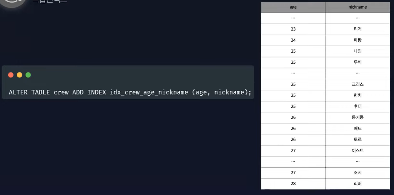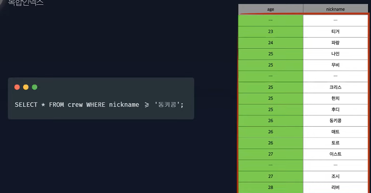 - 결합 인덱스, 다중 컬럼 인덱스, Composite Index라고도 불림