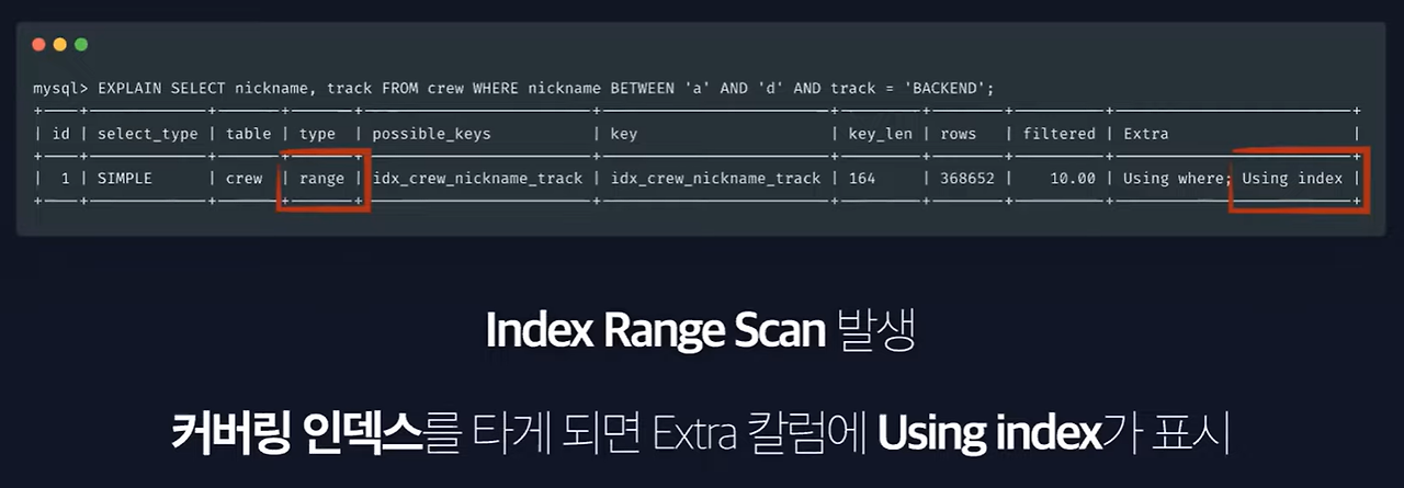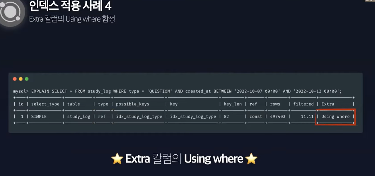 실행 계획을 판단할 때, type만 보고 실행 계획이 인덱스를 탔다, 안 탔다 판단하는 것보다 Extra 컬럼까지 함께 고려해서 인덱스가 적절히 탔는지를 고려해줘야 한다.