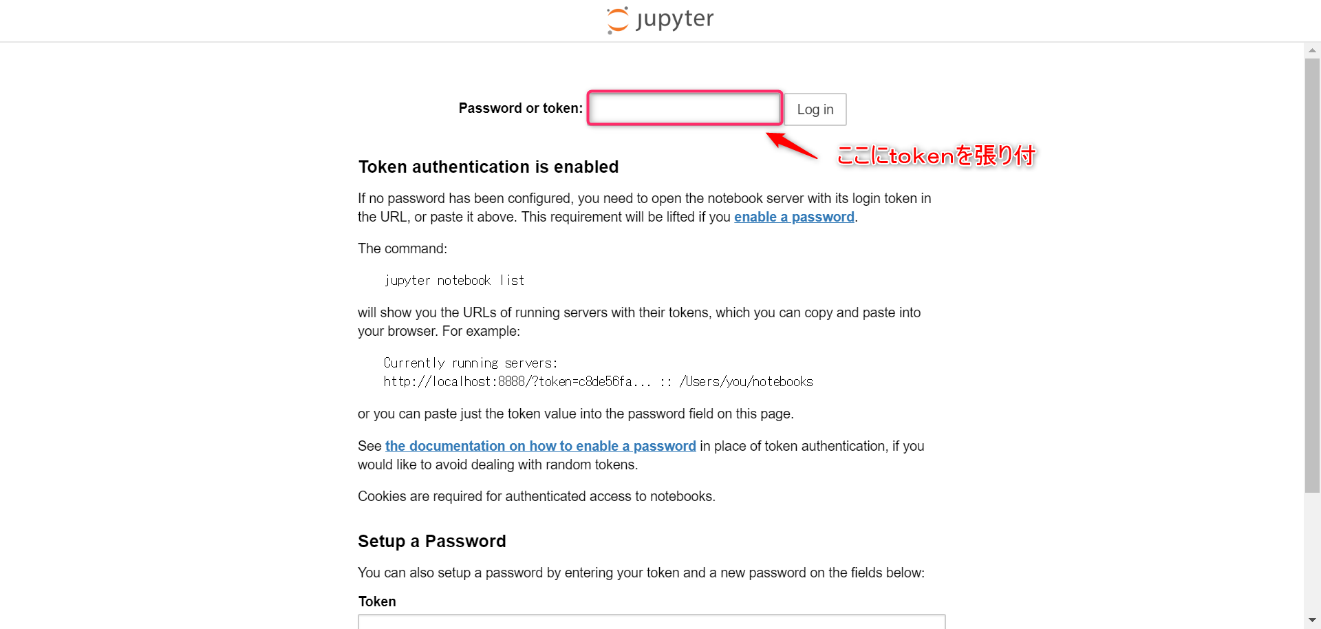 ブラウザの入力ボックスにtokenを貼り付け、ログインする。http://(~ or 127.0.0.1):8888/?token= {ここをコピーする}